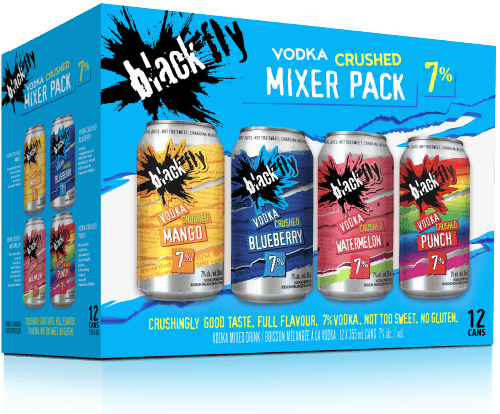 Black Fly’s Vodka Crushed Mixer is an exciting collection of bold and refreshing vodka-based cocktails, featuring four distinct fruit flavors. Made with real fruit juices and 7% smooth Canadian vodka, this pack delivers vibrant, well-balanced drinks that are full of flavor yet not overly sweet.